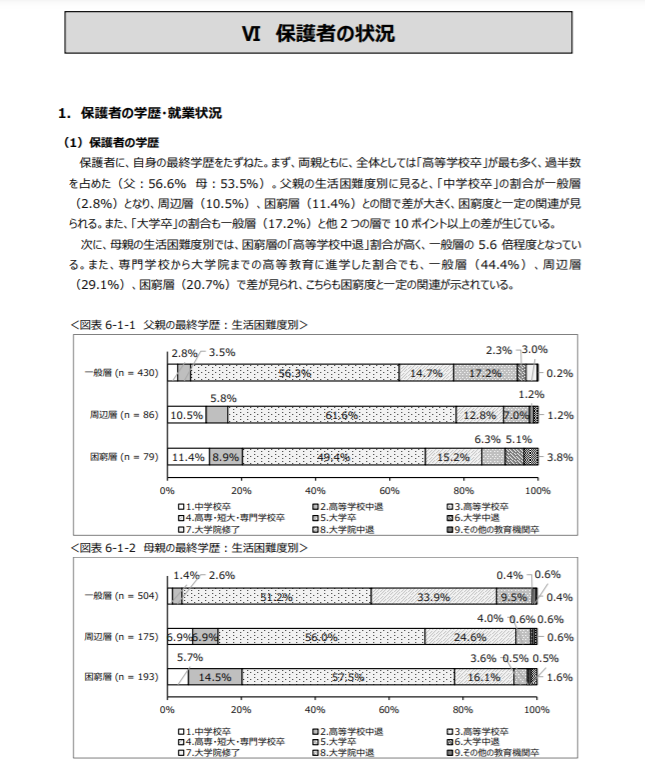 見事に、学歴と収入の相関関係が見て取れますね。《母親の生活困難度別では、困窮層の「高等学校中退」の割合が高く、一般層の5.6倍となっている》との記述もあります。