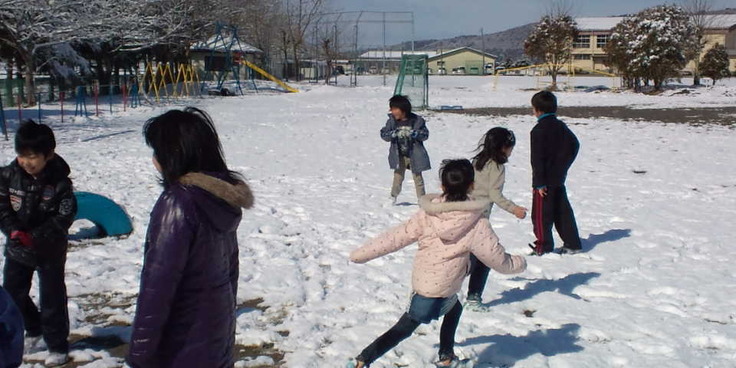 もうすぐ進級の時を迎える思い出づくり。雪が降ったので思いっきり校庭で遊びました。