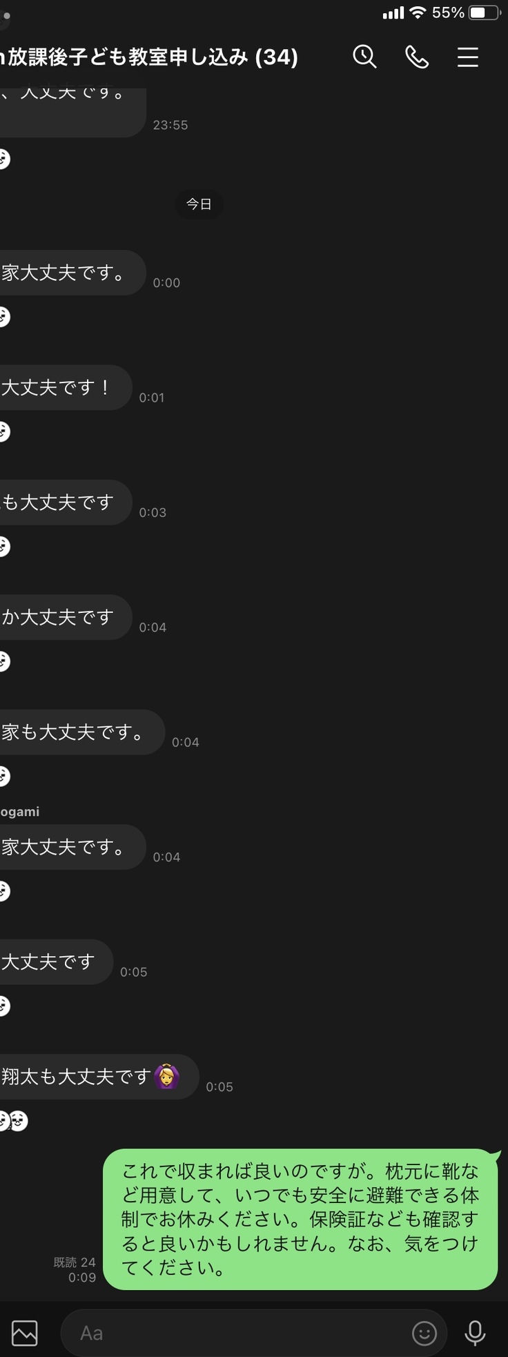 Bremenの被害を確認したあと、LINEで安否確認。皆様無事との連絡でほっといたしました。