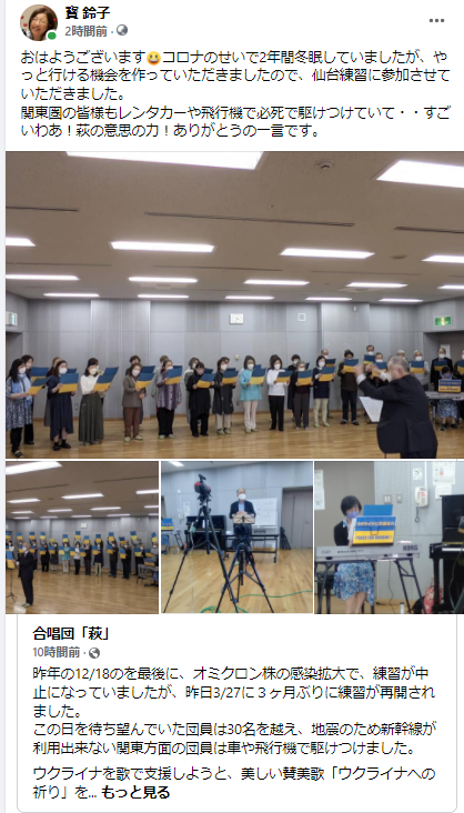 先日は、合唱団「萩」の皆様が、「ウクライナの祈り」を歌うというので、2年ぶりに仙台練習に参加して参りました。この曲は、萩の指揮者のお一人の斎藤廣子先生が送ってくださったものです。紛争地ウクライナの子どもたちが命の危険に晒されることなく、生きている喜びを味わう日が来ることを願って歌いました。