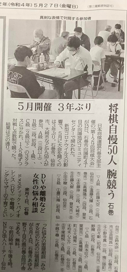 先日の新聞に、石巻市内の日本将棋連盟石巻支部が主催する将棋大会の結果が載っていました。