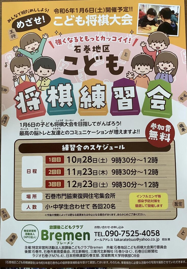 おかげさまで今年度も「石巻地区こども将棋大会」に向けた練習会が10月28日からスタートします。藤井聡太8冠の誕生で、盛り上がりをみせている将棋界。練習会や本番の大会に多くの子ども達が参加することを願っております。
