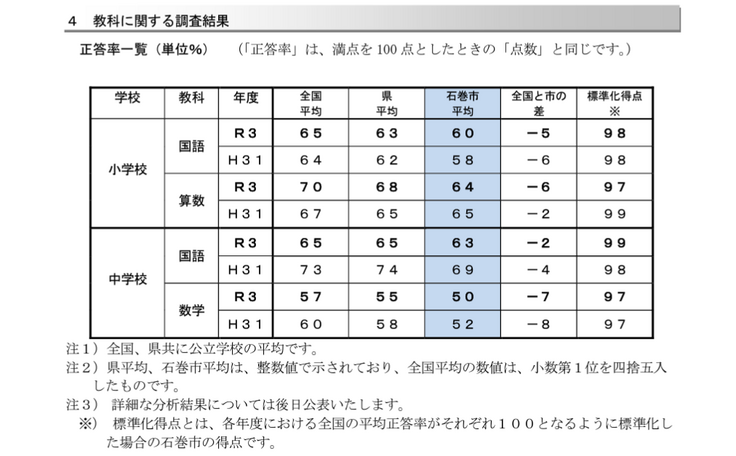 ご存知かとは思いますが、宮城県は近年の学力テストでは全国40位程度に位置しています。その宮城県平均に2ポイントから8ポイント及ばないのが石巻市の現状です。震災以後の混乱で十分な学校教育が行えなかったことが、未だに尾を引いています。