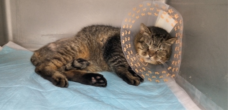 いつものようにカラーを着けて横になっているけど…君、更に顔が大きくなった?😅 なんか…太った?