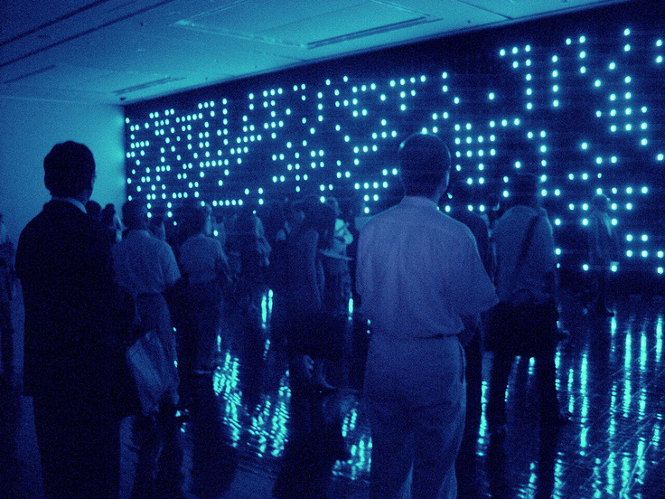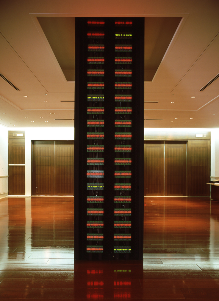 宮島達男さんは、2002年の開館より設置している館内の4つのコミッションワークの一つ《Opposite Vertical on Pillar - 133651 series -》の作者です。館内エントランスの中心に、発光ダイオードの点滅による、美術館の鼓動を象徴する光の柱を設置しています。
