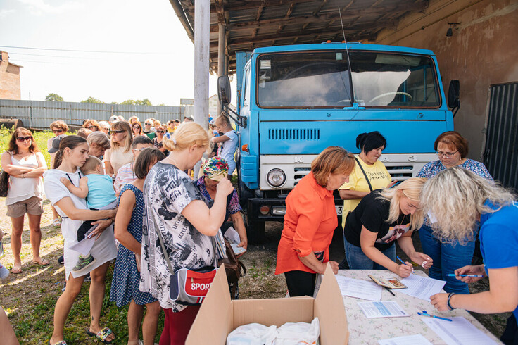 こちらは、リヴィウから 1.5 時間のところにあるウクライナ西部の村サンビルで、避難民に人道支援物資を配布する様子です。パッケージはまず袋に詰められ、次に箱に保管されます。必需品の 484 パッケージを梱包するには、8 人のボランティアが 7 時間を必要とします。パッケージは困っている人々に届けられ、食材は地元で作られているため、地域経済にも役立ちます。