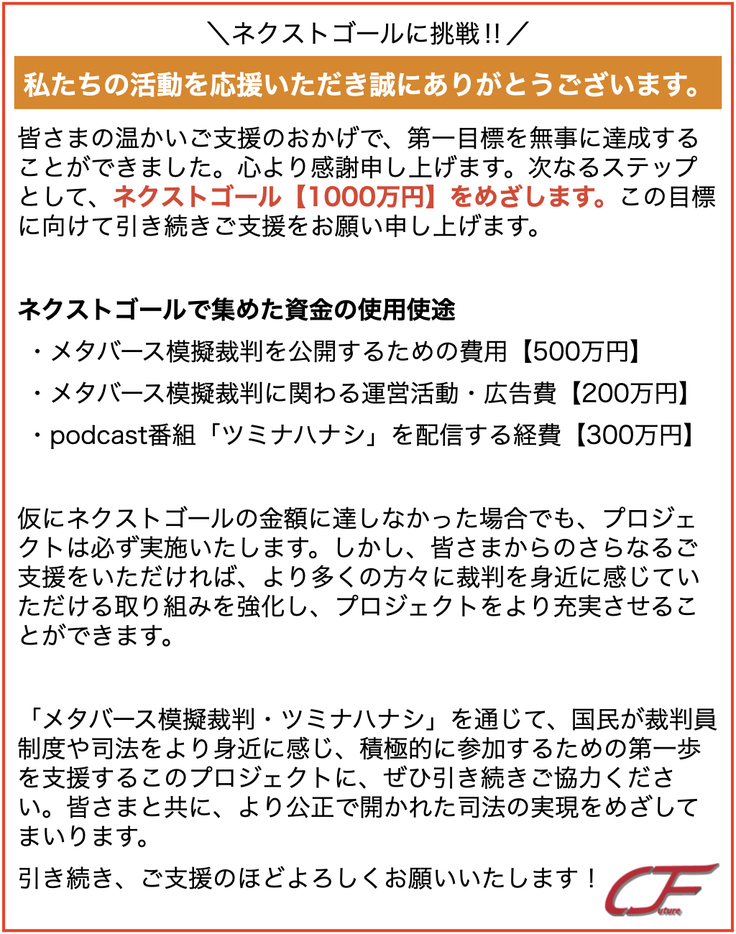 これらの活動を通じて、国民一人ひとりが司法について正しく理解し、興味を持てるような環境を作り出したいと考えています。この革新的な試みと私たちの幅広い活動をご支援いただける方は、ぜひクラウドファンディングでの支援をお願いいたします。