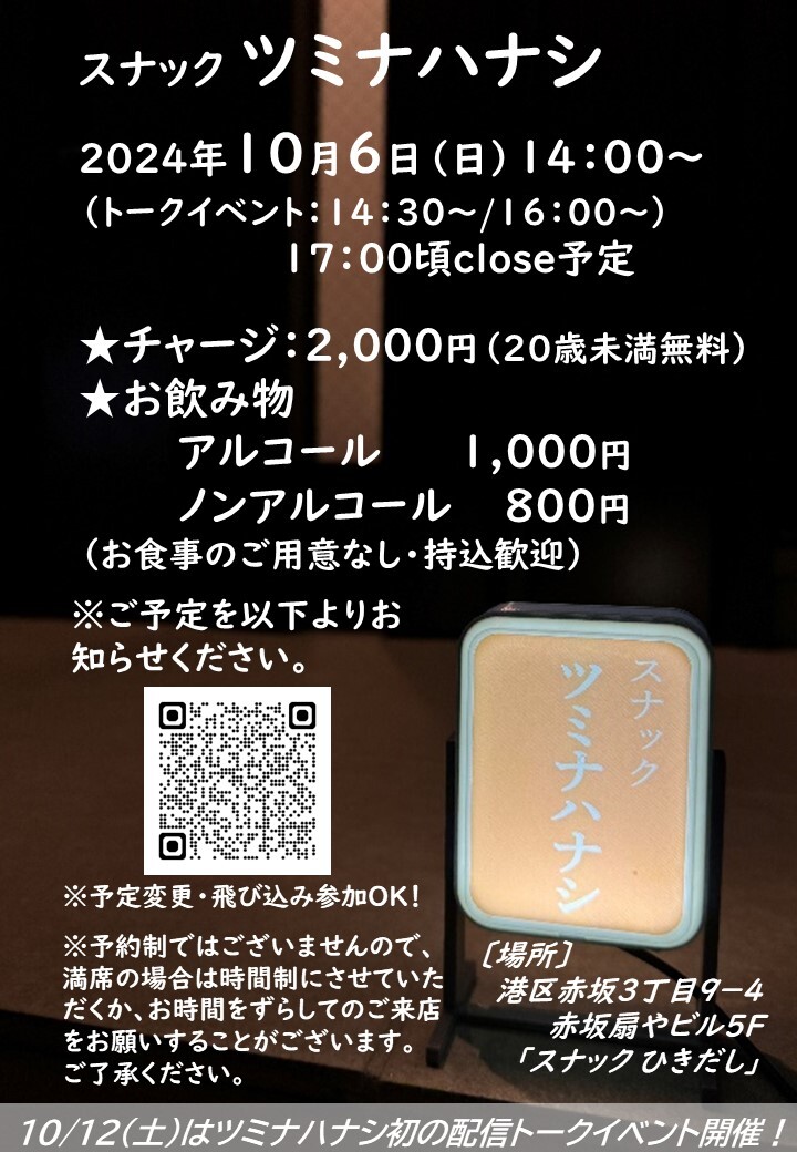 お酒が好きな人も飲まない人もみんなで語りあいましょう♪途中に『ツミナハナシ』のトークイベントも開催します。最近の”ツミナハナシ”のこと、おすすめエンタメなど、楽しくお話しできればと思います。芙美ママとチーママ裕貴ちゃん、そして丸ちゃん教授が目から鱗のお話を用意して待っております。