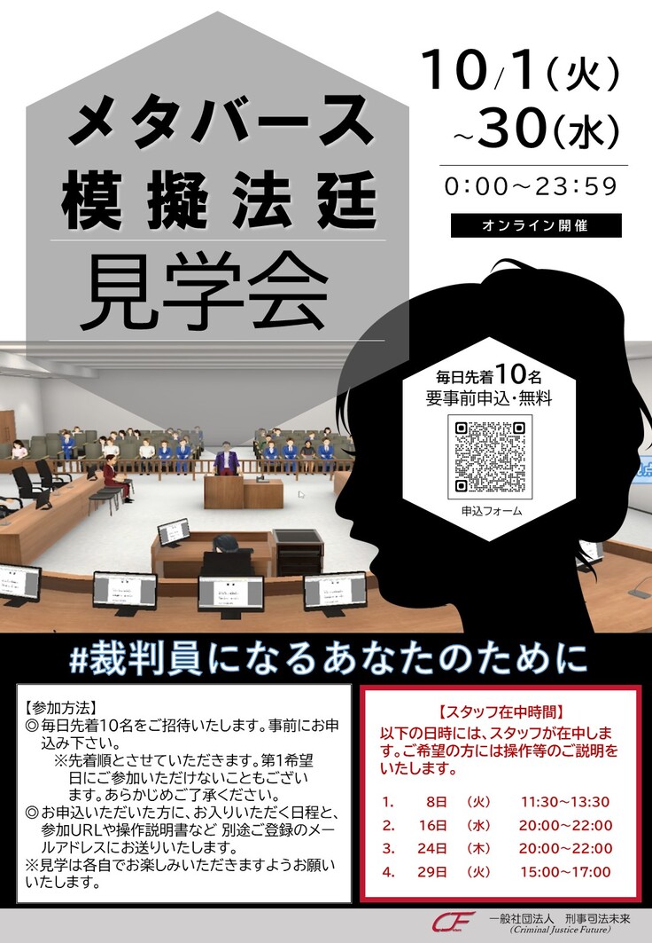 以下の通り、10月1日から30日まで、1日限定10名様となりますが、自由に法廷内を見学していただくことができます。この機会にぜひ、ご参加ください。