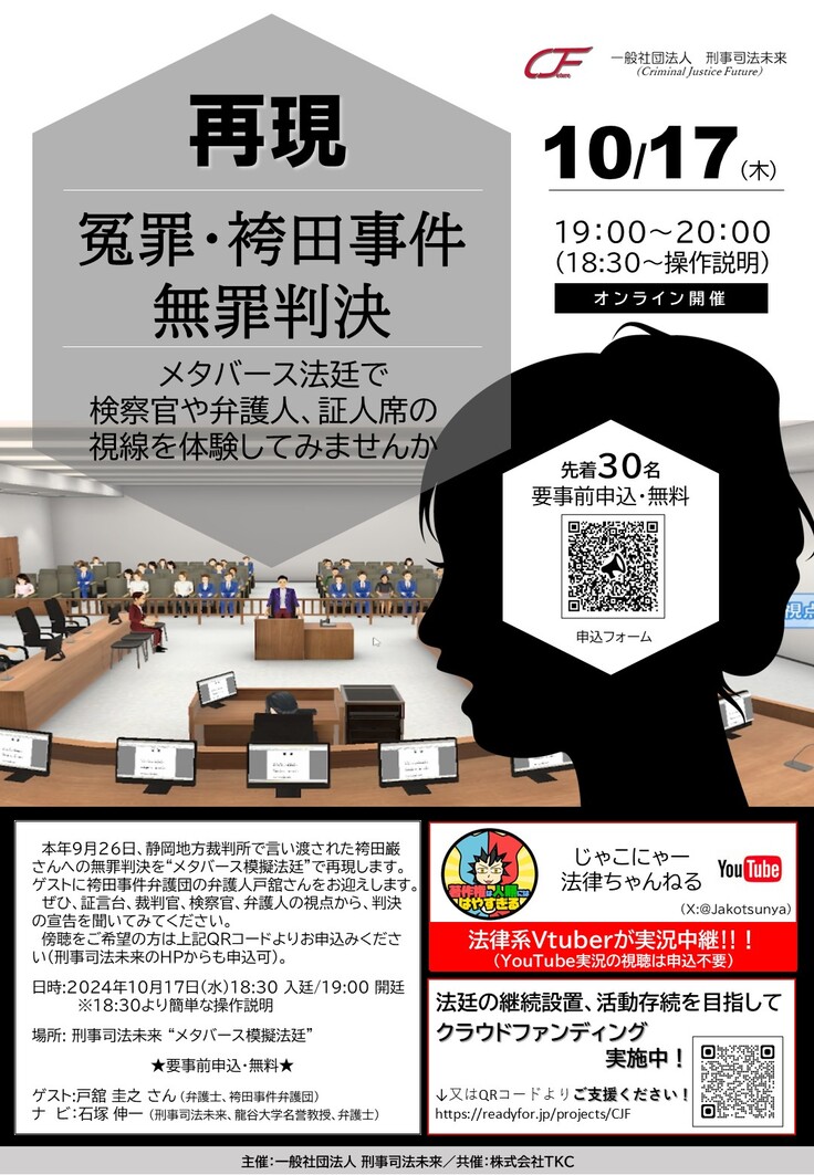 本年9月26日、静岡地方裁判所で言い渡された袴田巌さんへの無罪判決を“メタバース模擬法廷”で再現します。ゲストに、判決現場に在廷した袴田事件弁護団の弁護人戸舘氏をお迎えします。