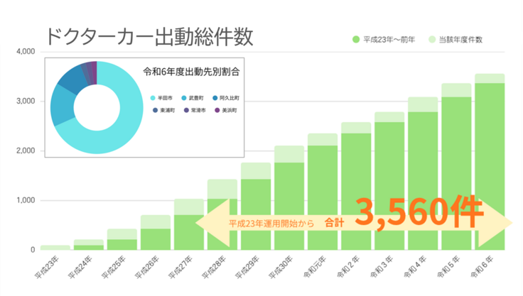 この私たちの活動の最前線を走り、命を救うための初めの一手を担うのが、ドクターカーです。これまでの出動総件数は3,500件以上にのぼります。