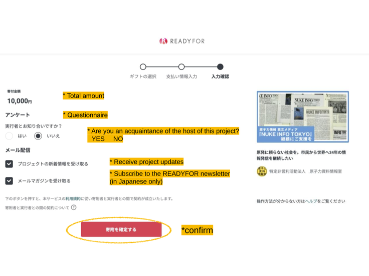Please select the amount you would like to donate (¥5,000 or ¥10,000 or ¥50,000) and complete payment details through Paypal.