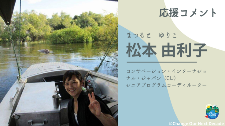 今回応援コメントを頂いたのはコンサベーション・インターナショナル・ジャパン(CIJ)シニアプログラムコーディネーターの松本由利子様です!