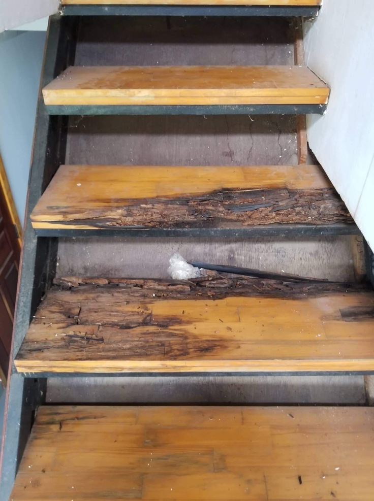 シェアハウス山下道場の階段。雨漏りで木が朽ち壁がひび割れ状態に