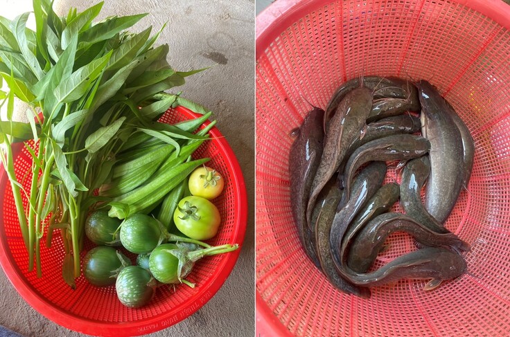 タマイ保育園の畑と養殖池で採れた野菜と魚