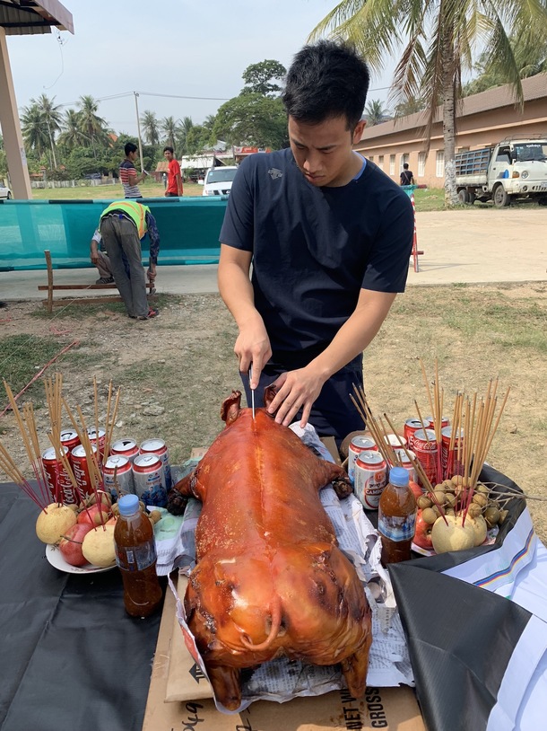 12/27 着工式にて豚の丸揚げを一部裁く。(ものすごく脂っぽかったです。)