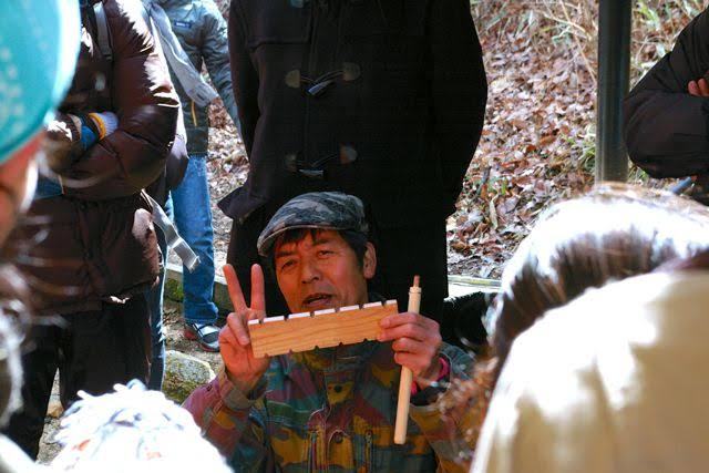 しかし、本番にゃ強い、あっしは、度肝を抜いてやらにゃ!と一発目の火起こしは、弓ぎり式で一人でやったんすが、ギャグを交えつつ、バッチリ上手くいきやした(←ほとんど徹夜で、スペアも含めて20セットの火起こし道具を改良した甲斐がありやした!)!