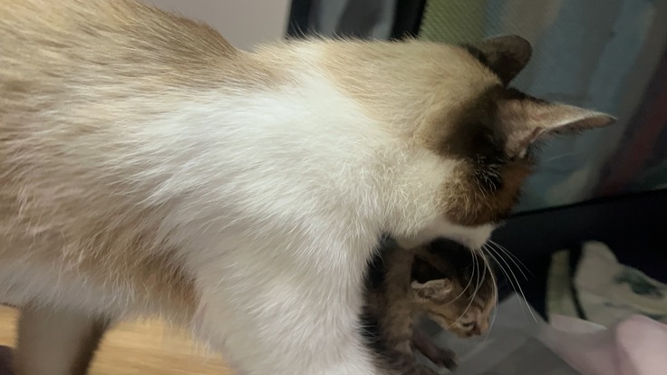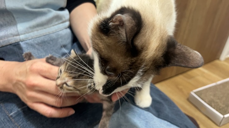 排泄中は子猫が泣き出してしまうとデイジーが『返してー』とお家へ連れて帰ってしまうので