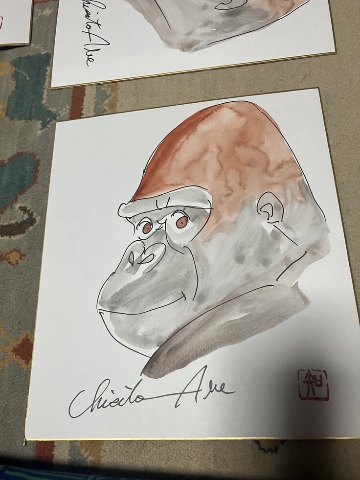 阿部様はゴリラが大好きで世界中のゴリラを描き続けてこられました。日本各地で個展を開かれ、メディアでも取り上げられるほどゴリラが大好きな画家です。