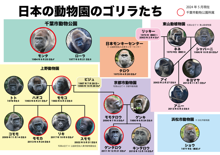 現在、千葉市動物公園に帰属しているゴリラはモンタ、モモコ、モモタロウ、モモカ、ゲンタロウ、スモモの6頭となっており、これは国内最多となっています。