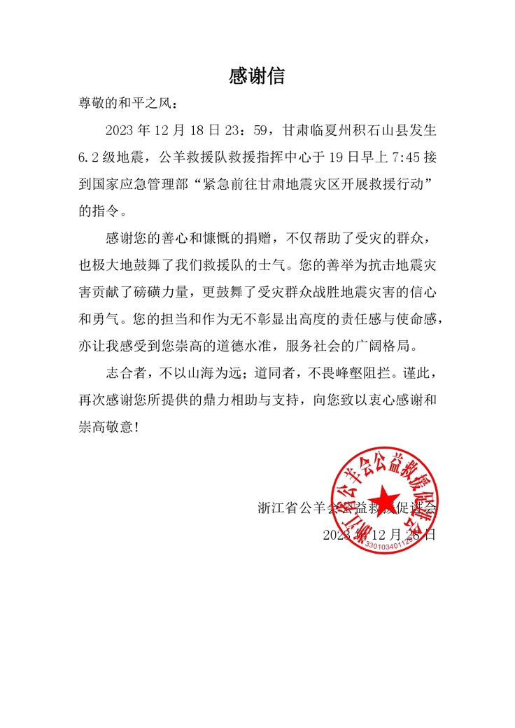 公羊会レスキューチームは甘粛省地震救援のために、合計で隊員33名(浙江チーム9人、陝西チーム6人、甘粛チーム10人、四川チーム8人)と捜索救助犬2頭を派遣しました。生命探知機などの専門的な救助用資機材を携帯し、19日午後18時頃に被災地に集結、甘粛の積石山県大河家鎮に到着しました。