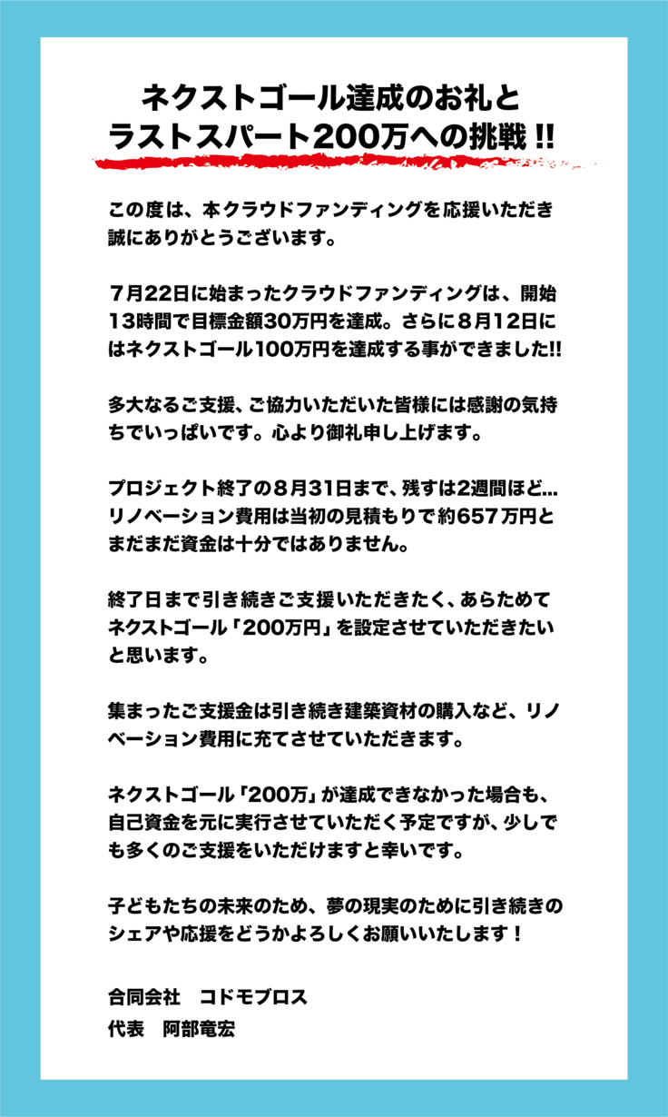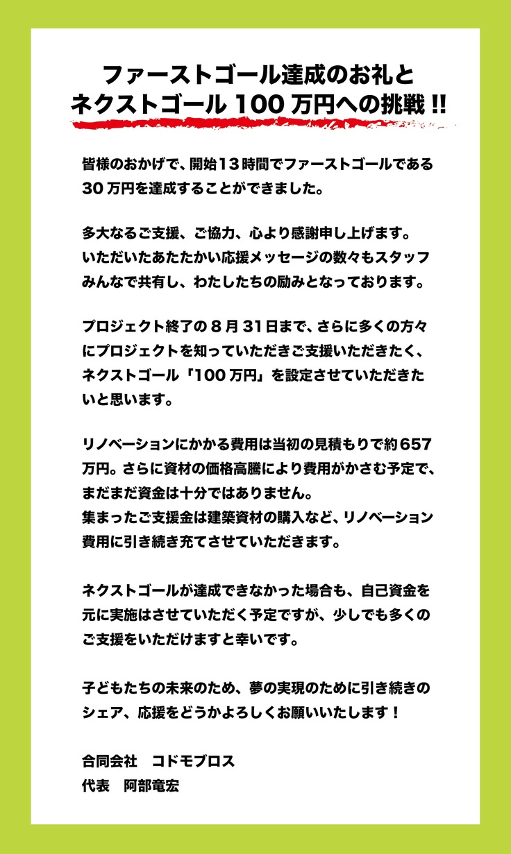 集まった資金は、アトリエコドモブロス&アートスペースコドモアウラの3階建てビルの リノベーション費用に利用させて頂きます。