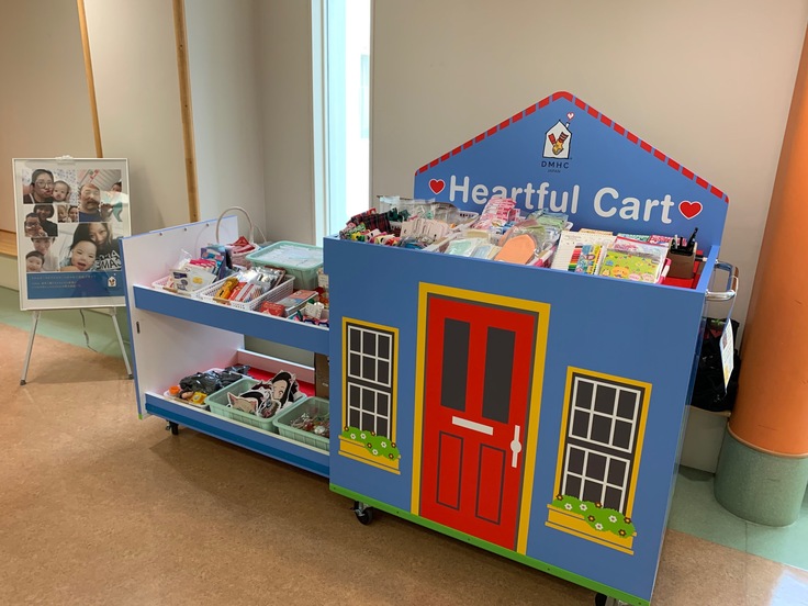私たちはこのカートを「ハートフルカート」と名付け、子ども達へ配布する「文房具」や「おもちゃ」をのせて病棟などで活動しています。また、お子さんに付き添っているご家族のために、付き添いに必要なアメニティグッズや日用品なども一緒にのせて、お父さんやお母さん達のサポートも同時におこなっています。