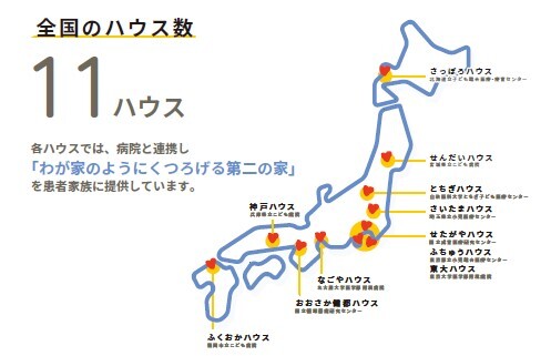 ドナルド・マクドナルド・ハウスは、闘病中の子どもとご家族がすぐ側にいられるよう、1泊1000円という安価でご家族が滞在できる施設です。小児病院に隣接した形で全国に11箇所あります。
