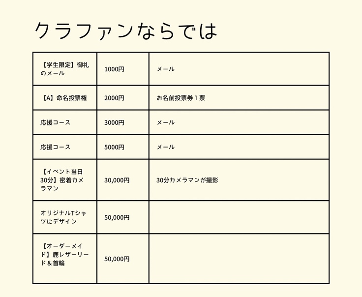 【資金の使い道】 鹿レザーなめし費用 10万円 ブランドデザイン費 20万円 ブランドブース費 5万円 イベント広告費 10万円 イベント装飾日 15万円 警備費 14万円 会場設営費 66万円 出演費 15万円 グッズ製作費 8万円 手数料 10万円 人件費 18万円 イベント運営費 58万円 このうちの50万円に使用させていただきます。
