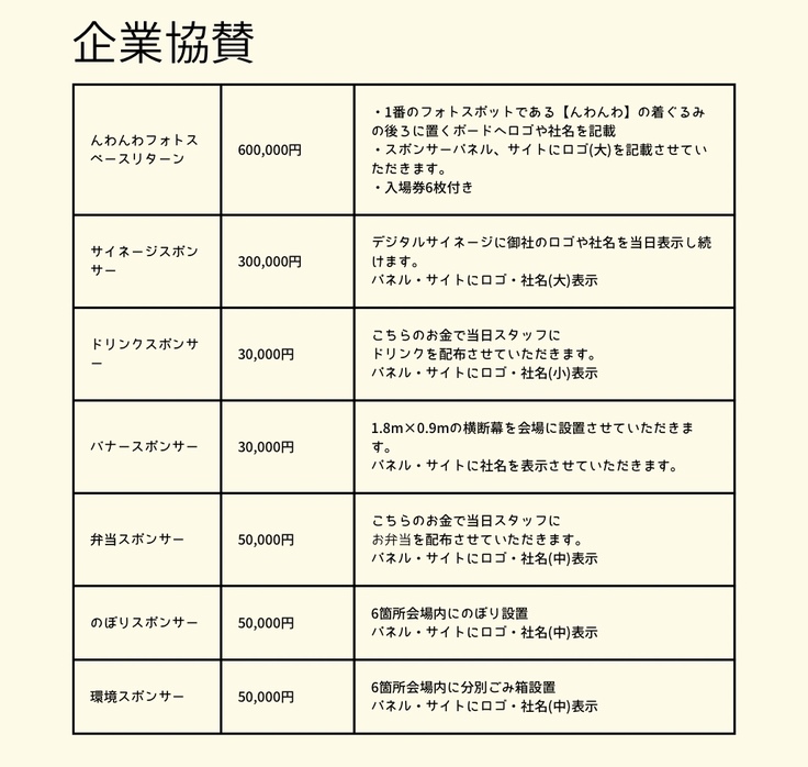 プロジェクト成立後、天災等やむを得ない事情(緊急事態宣言などコロナウイルスによる影響を含む)によりイベントが開催できなかった場合、次回イベント(2025年開催イベント)の際に活用させていただきます。