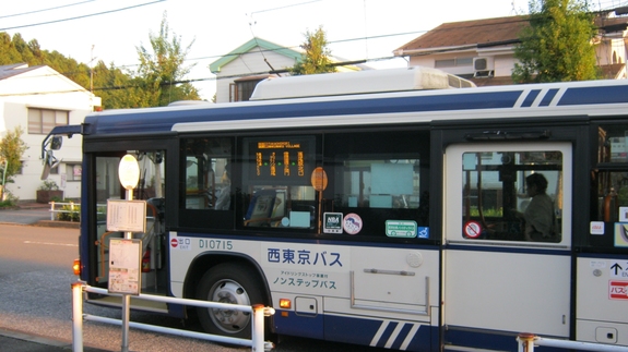 【夢の図書館の正面にある「タウン中央」バス停に到着した西東京バス】