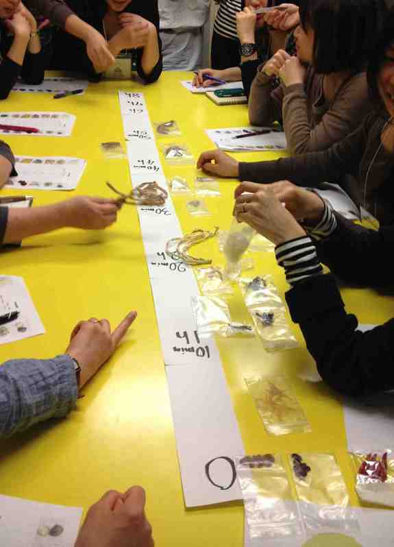 (乾物時間を体感することで「乾物のある生活」にシフトできるように、時間軸を使ったワーク。実は乾物の8割方は20分もあれば戻る。帰宅して水につけてシャワーを浴びて戻れば下ごしらえ完了。実は乾物料理は下ごしらえがラクで生ゴミもでないお気楽食材なのです)