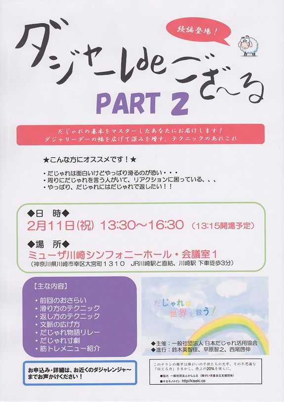 ”ダジャーレでござ〜る!PART2”は、”ダジャーレでござ〜る!”参加済みであることが参加資格となります。次の”ダジャーレでござ〜る!”開催は3月1日(日)午後になります。既に参加のお申し込み受付は開始しております。どうぞご予定を確保していただき、ご参加ください。詳細はこちら