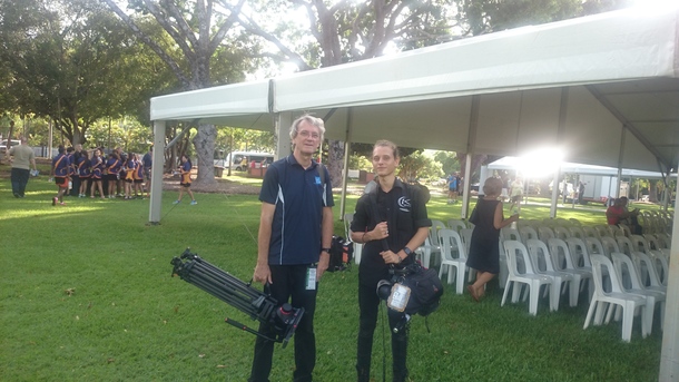 前回撮った分の一部が没(ボツ)になったので、式典の前に取り直しました。撮影中は写真を撮る余裕が無かったので、終わってから撮らせてもらいました。ディレクターのマークさん(左)と、カメラマンのベンさん(右)です。プロデューサーである私が不慣れなためにし映像や写真が十分でなく、編集のビンセントさんにはご苦労をおかけしていますが、何とか資料をかき集めてつないでくれています。