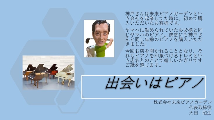 2歳から習い始めたピアノを14歳で指を複雑骨折し断念。それでもやっぱりピアノが好きと今まで趣味として現在も弾いています。離婚と共に置いてきてしまったピアノをもう一度手に入れたいと願い自分と同じ生まれのピアノに出逢い名古屋からお迎えしました。運命的な出会いと共に、ド・レ・ミ~と音階が上がっていくように美容室Doremi の活躍も上昇しますよう願って店名として名付けました。