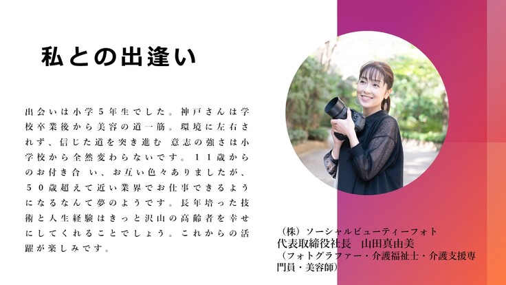 ヘアーもネイルも着付けも出来るトータル美容を目指し、ご希望に添える美容を最大限生かし、綺麗で居られることの精神衛生が与える影響を実現し、美容室を開設し訪問美容をさせていただきます。自身が培ってきた美容技術や仲間の協力を得ながら、一般のお客様にも訪問美容をお望みのお客様にも喜んでいただける美容室作りを計画しています。