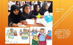 学校で勉強する女の子の写真とメッセージ、活動報告書、アフガンの女の子がマットに座り嬉しそうに勉強するイラストのポストカードをご送付します。