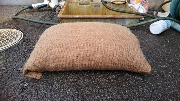 このECO土嚢の制作では、袋の素材として従来のビニール製ではなく、地球にやさしい自然素材である麻(ジュート)を、中身にはおむつなどにも使用されている、水に漬けるだけで自然に膨らむ「吸水性ポリマー」を用いています。使用後も1週間くらい天日で自然乾燥を行うことで元に戻ります。そして、通常の可燃ごみとして出していただくことができ、また、従来の土嚢では、中身が土や砂であるために作成場所は限定され、作成場所から設置場所への運搬も大変でしたが、ECO土嚢は水さえあればどこでも作成可能になります!膨らむ前の重さも500g程度で軽くて楽ちんです。