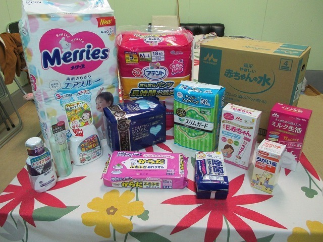 断水による衛生面への影響を考え、水、マウスウォッシュ、うがい薬、水のいらないシャンプー、アルコール消毒、体を拭くため大判ウェットティッシュ、大人用・子ども用おむつ、生理用品などを、福祉施設などのニーズに合わせて配付しました。