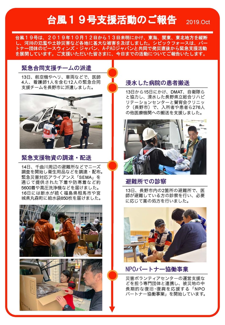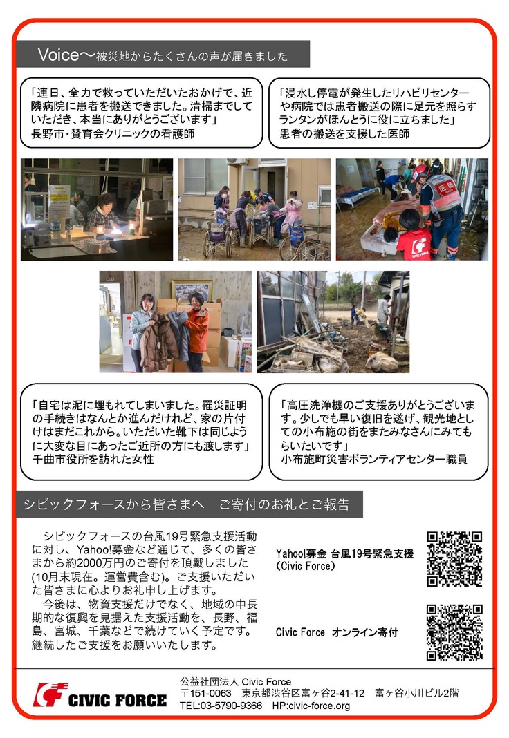10月12日から13日未明にかけて東海、関東、東北地方を縦断した台風19号は、河川の氾濫や土砂災害など各地に甚大な被害を及ぼしました。Civic Forceは、パートナー団体のピースウィンズ・ジャパン、A-PADジャパンと共同で発災直後から緊急支援活動を展開しています。今日までの活動をレポートにまとめました。ご一読いただき、ぜひご意見やご感想などをお寄せいただければ幸いです。