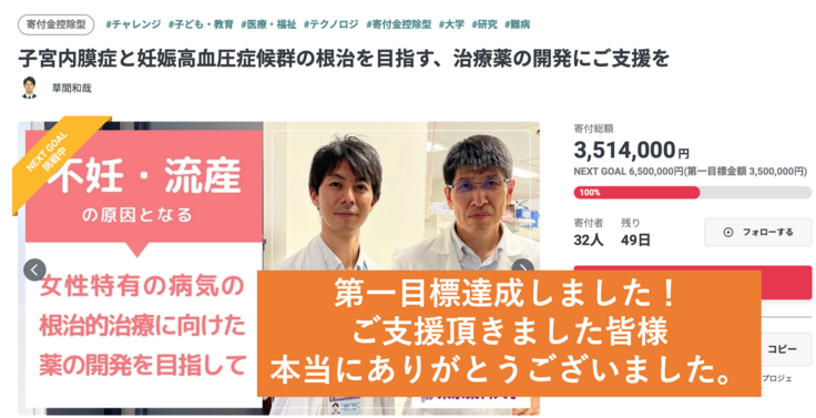 本クラウドファンディングにご支援くださった皆様のコメントから、子宮内膜症や妊娠高血圧症候群といった女性のQOLを下げる疾患をなくしたいという強い思いがあることも再認識させて頂き、研究者として身の引き締まる思いです。