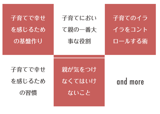 子育てを楽しむための方法や、子育てを通して幸福感を感じるコツを載せています。 子育てに不安やストレスを感じている方、子育てをもっと楽しみたいと思っている 方にぜひ読んでいただきたいです。