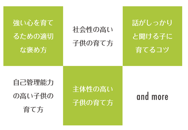 「主体性の高い子供の育て方」、「社会性の高い子供の育て方」、「落ち着かない、我慢できない、人見知りが激しいなどの子供の心の状態に対する効果的な指導方法」などが上げられます。