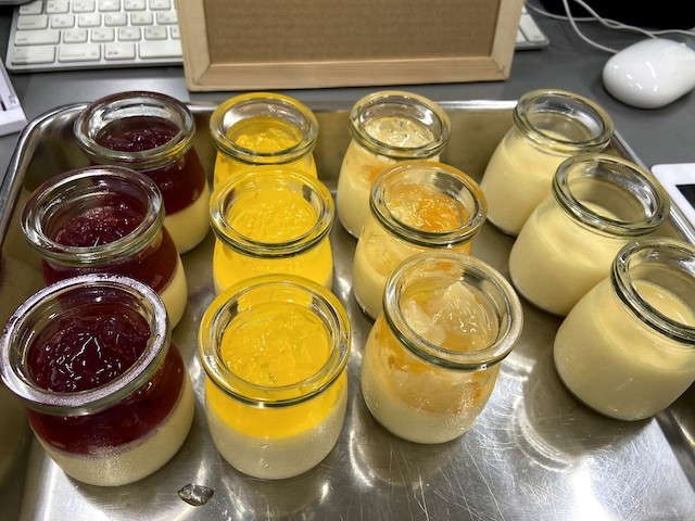 急にアイディアは浮かんできます。はちみつプリンにクラッシュしたゼリーを乗っけてみました。とてもきれいです。ゼリーをのせると甘みが強いので、ゼリー乗せ用にはちみつの分量を調節していきたいと思います。