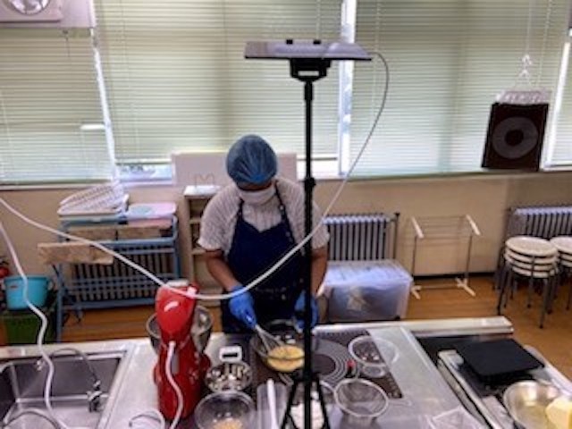 シフォンケーキの動画撮影の様子です。シフォンケーキは動画レシピがありませんでした。「メレンゲ王子」と呼ばれていた生徒(メレンゲを作るのが天才的に上手だったため)が、動画を編集する前に手順を覚え、一人で作れるようになっていたためです。動画で覚える生徒、写真カードの方が良い生徒、写真やイラストが無い方が良い生徒と、覚え方にはそれぞれ個性があります。今回は、最近導入した秘密兵器を使ったシフォンケーキ作りを2学期から始めるために、チーフが頑張りました。