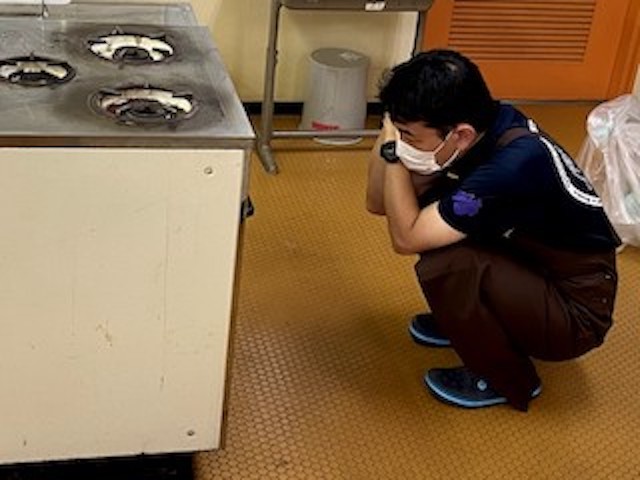 事務局長は…といえば、ケーキに焼き色がつくまで、歴史物のガスオーブンの前で見張り番。よーく見ると、ニコニコしています。ケーキが焼き上がる時、プク〜っとふくらむ様子を見ていると不思議にえがおになるんですよね。