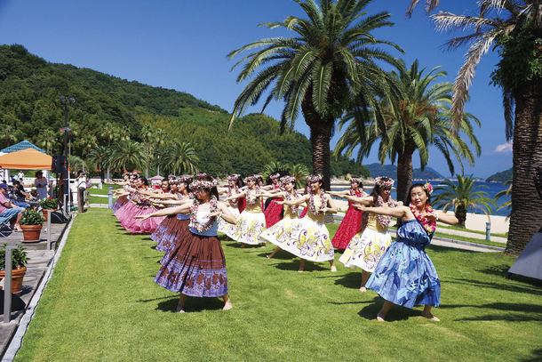 白い砂浜に青い海、海岸線にはヤシの木が並ぶ。カウアイ島と姉妹縁組を結んでいて、ハワイを感じる建物や、瀬戸内のハワイのアロハな土曜日と銘打った「サタデーフラ」なども開催されています。日本有数の海水浴場「片添ヶ浜」もあります。そんな場所が今回舞台の周防大島です。
