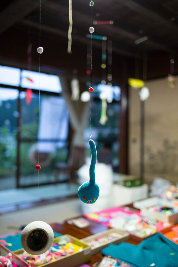 天井からぶら下がるスサイさんのニンギョウたち。不思議な世界が一気に広がりました!スタッフのワクワク感が自然と盛り上がります。