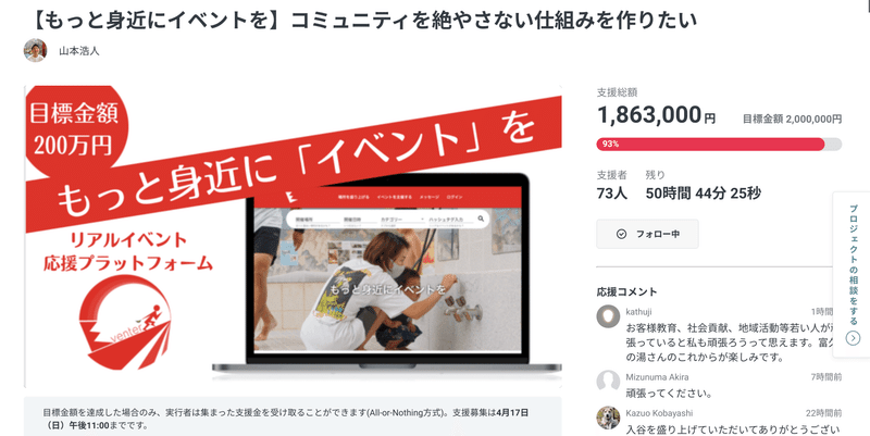 始めは僕一人の挑戦だったものが、今では73人の方からのご支援・応援を頂いております。