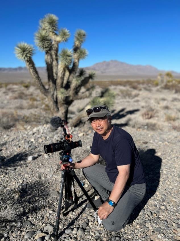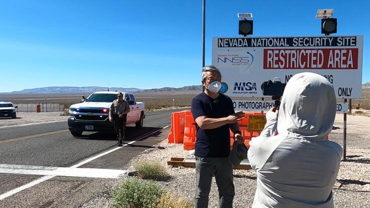 ▲ネバダ核実験サイト入口ゲート付近にてレポート